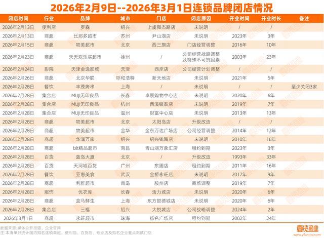 据壹览商业不完全统计,2026年2月9日——2026年3月2日,国内知名连锁超市、便利店、百货店、专业店及知名企业重点测试门店,共有18个连锁品牌关闭了至少24家门店。